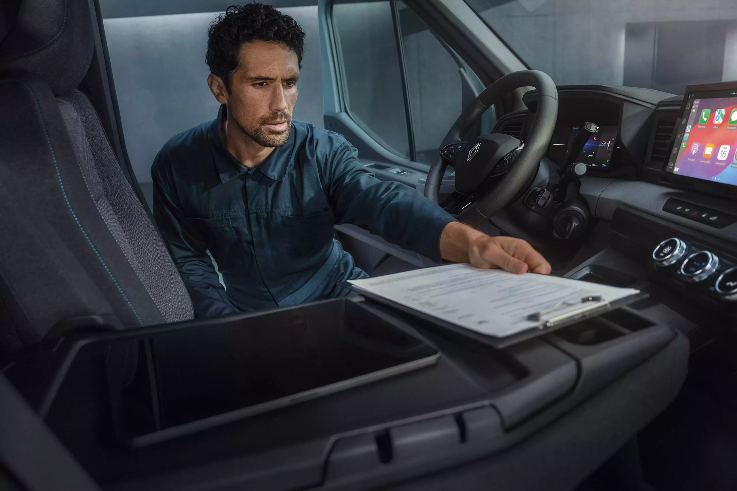 - Oficina móvil: Cabina con 135 litros de compartimentos de almacenamiento y tomas de corriente de 220 V para mantener tus dispositivos cargados.